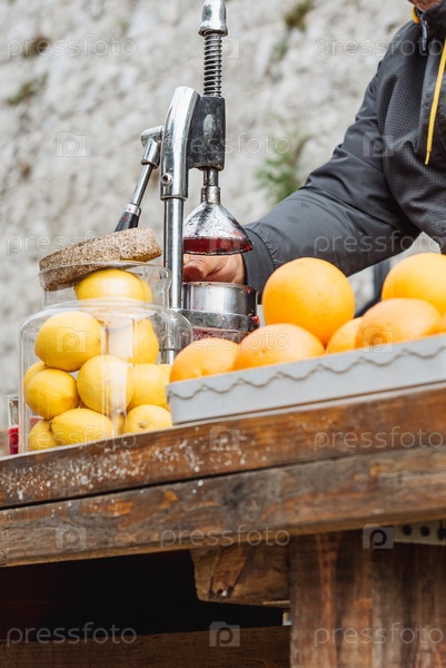 Человек делает свежевыжатый сок из апельсинов и лимонов на улице летом, детоксикационные напитки для здорового питания и образа жизни