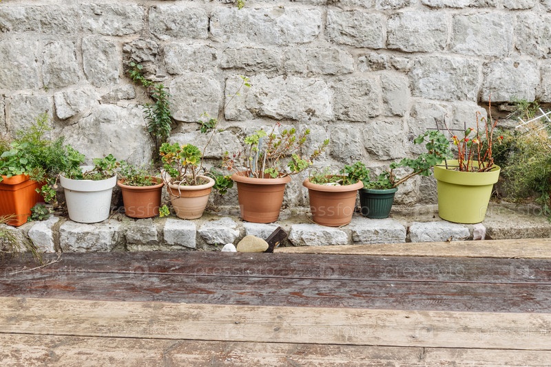 Помещенные в горшки комнатные растения, стоящие снаружи в саду, милый внешний дизайн декора