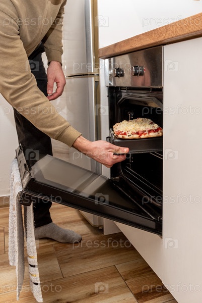 Мужчина готовит домашнюю пиццу на кухне, шеф-повар ставит печенье в духовку для выпечки