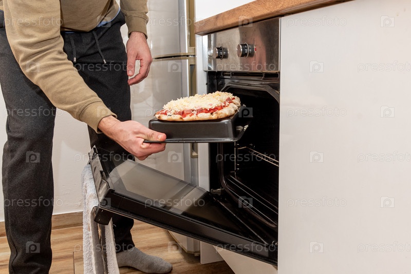 Мужчина готовит домашнюю пиццу на кухне, шеф-повар кладет печенье в духовку для выпечки