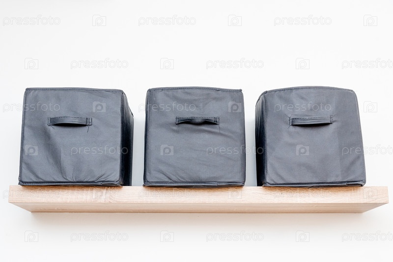 Серые квадратные коробки для организации пространства и хранения вещей на полке в спальне жилой квартиры