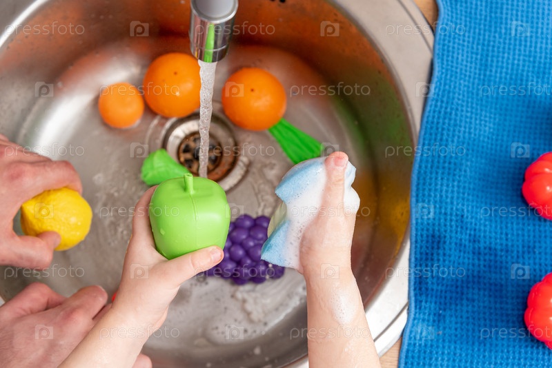 Мужчина и девушка моют пластиковые фрукты и овощи, отец-дочь проводят время вместе