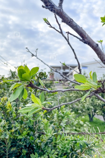 Первые молодые листья цветут весной на ветках деревьев в лесу, светло-зеленый лист весной