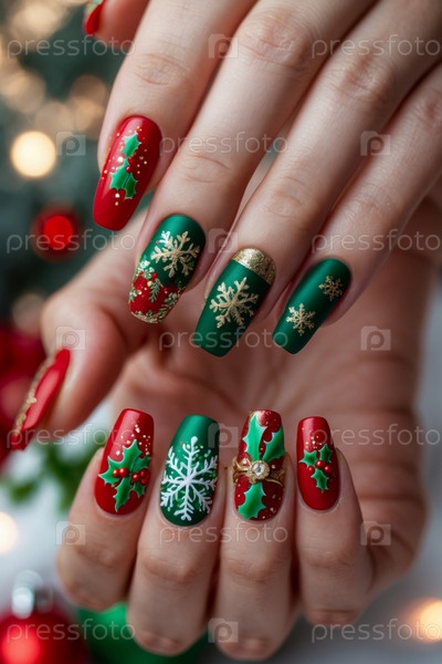 Рождественский маникюр на тему ярко-красного и зеленого цвета с узорами праздничных атрибутов AI Generative