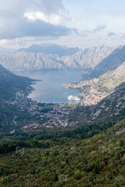 Вид с канатного автомобиля на залив Бока-Котор, большой туристический лайнер, припаркованный среди гор