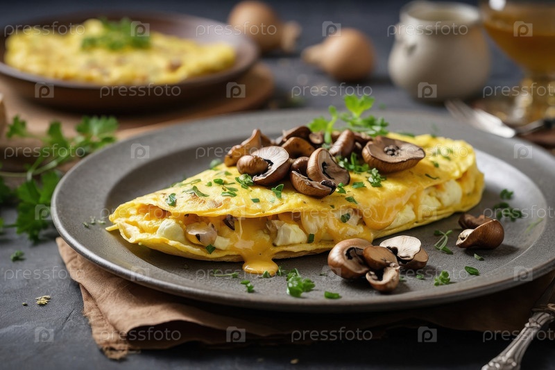 ИИ генеративные яйца французского омлета с грибами и сыром, вкусная традиционная кулинарная бранч-кухня