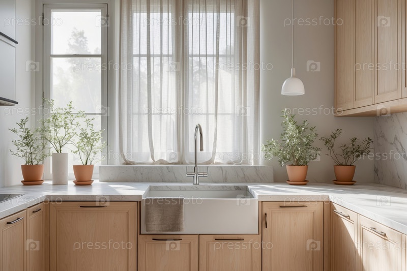 Современный стильный модный кухонный интерьер с легкой деревянной мебелью и бытовыми принадлежностями AI Generative