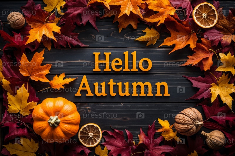 Надпись на поздравительной карточке Здравствуйте осень Осенний фон желтый и красный листья листок падение AI Generative