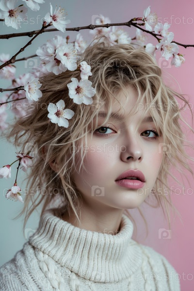 ИИ генеративный портрет молодой женщины естественно чистый помада макияж, модель моды Красота в цветах