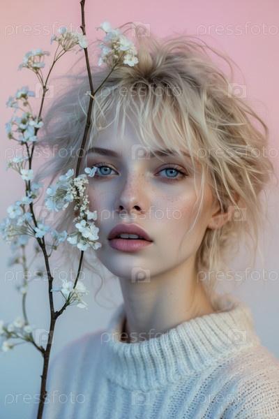 ИИ генеративный портрет молодой женщины естественно чистый помада макияж, модель моды Красота в цветах