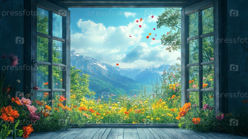 Открытое окно с видом на луга диких цветов и горы