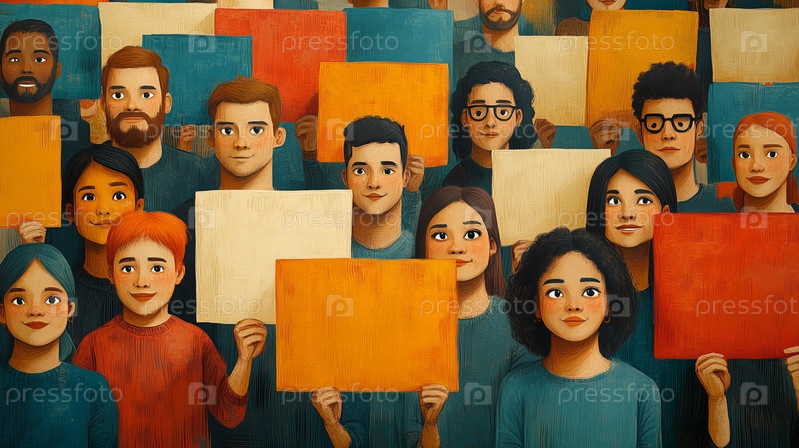Художественная иллюстрация разнообразной толпы, держащей красочные знаки