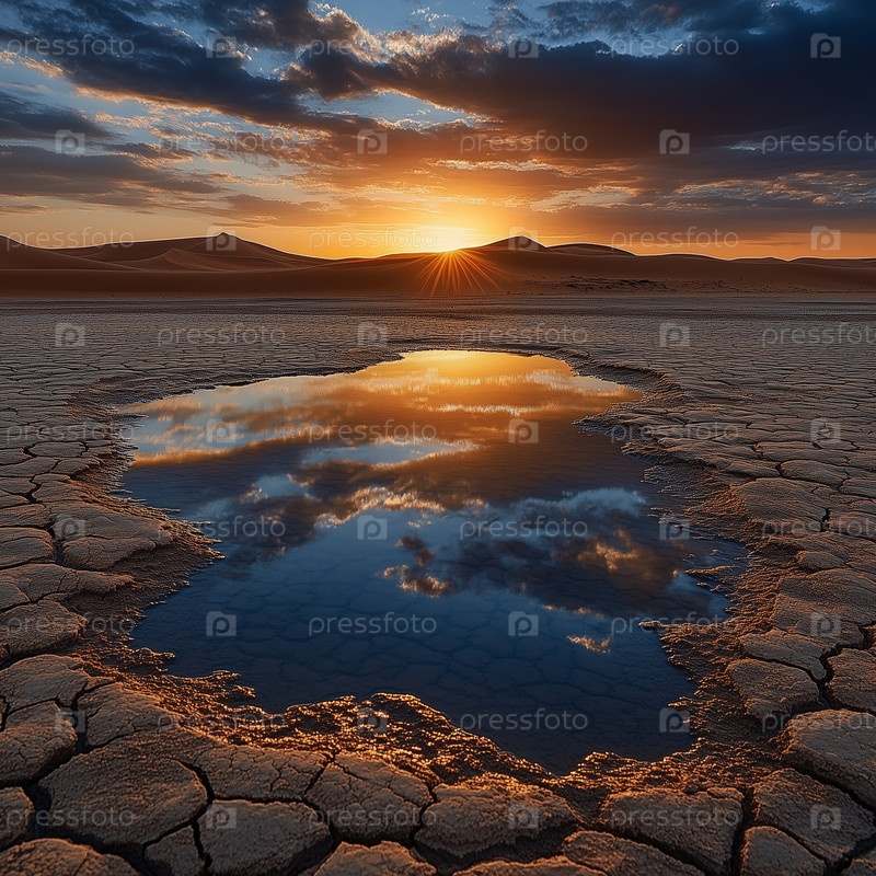 Закат солнца отражается в воде на трещинах пустынного пейзажа