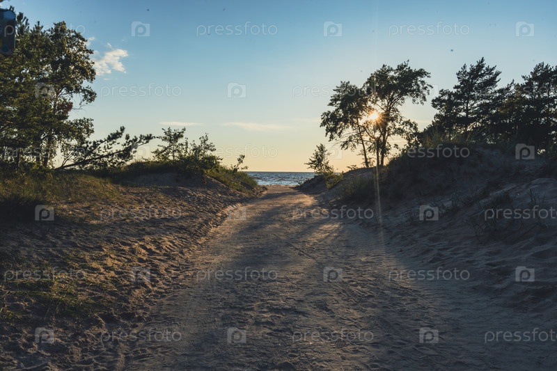 Песчаная тропа ведет к пляжу с солнечным светом сквозь деревья