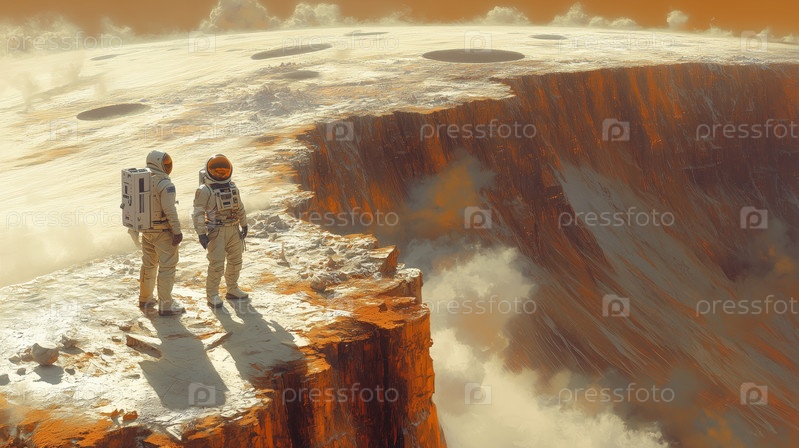 Астронавты наблюдают за огромным кратером на чужой планете