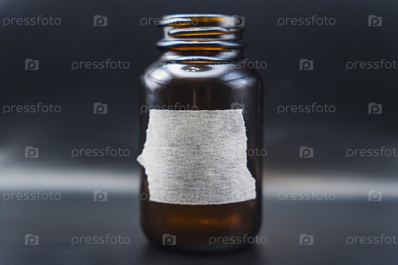 Бутылка из коричневого стекла с разорванной этикеткой на темном фоне