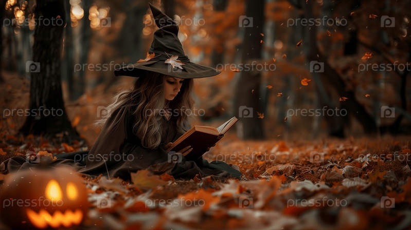 Девушка в колдовской шляпе читает книгу в осеннем лесу
