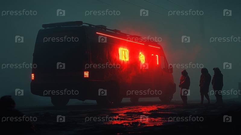 Силуетные фигуры возле освещенного фургона в туманной ночной сцене
