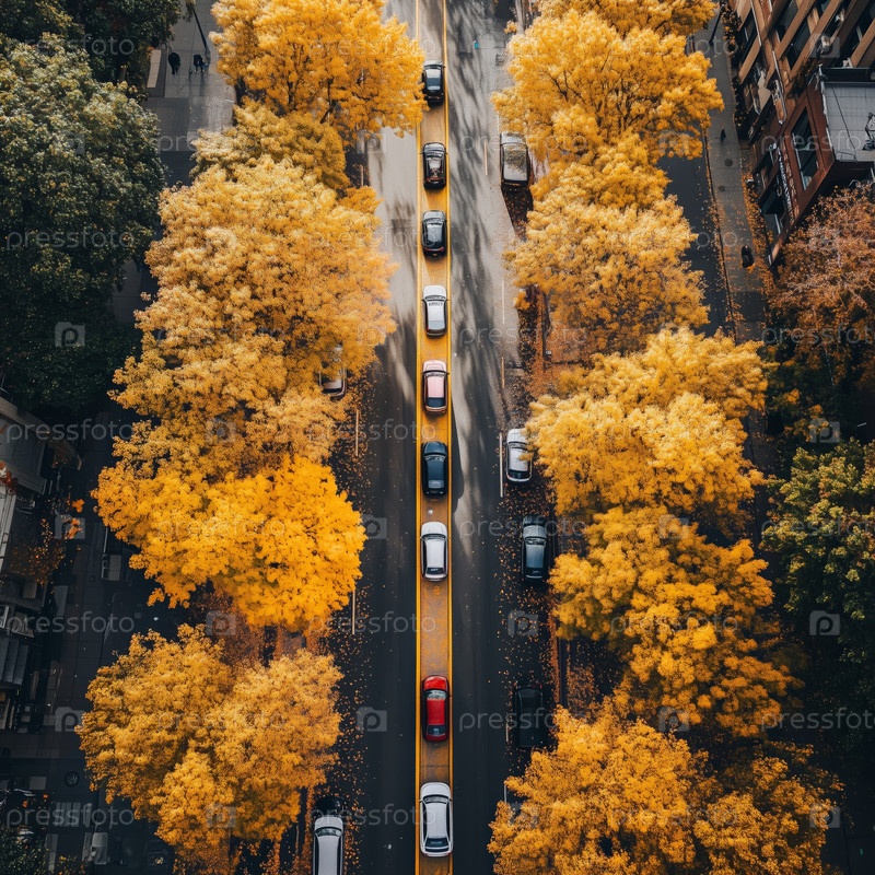 Вид с воздуха оживленной дороги, выложенной осенними деревьями на закате солнца