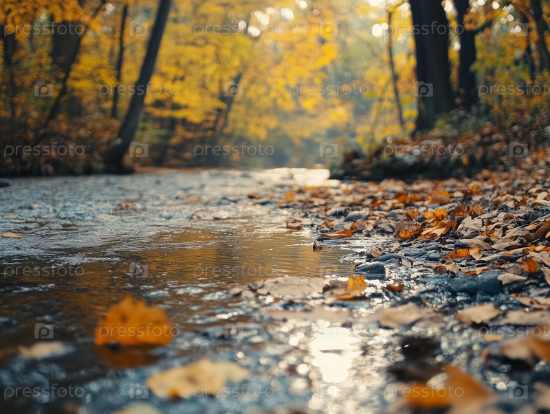 Мирный осенний лес с золотыми листьями у ручья