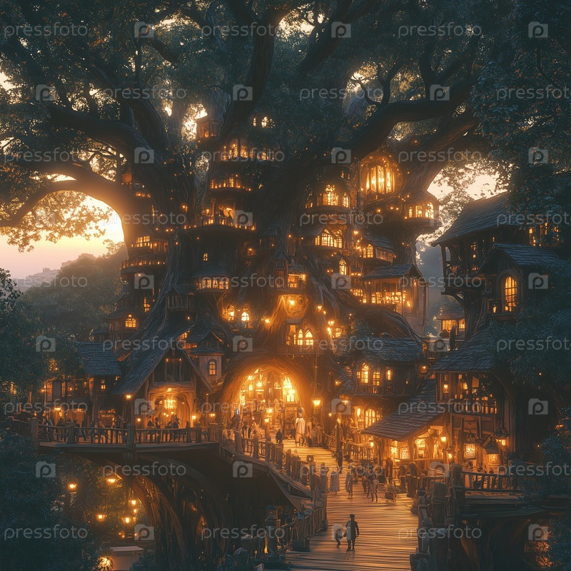 Зачарованная деревня, расположенная в гигантском светящемся дереве на закате