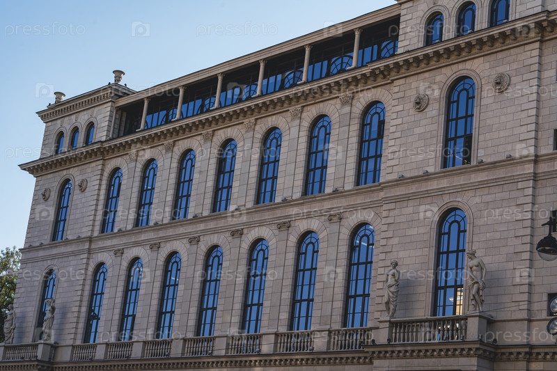 Фасад исторического здания с рядом арочных окон и статуй