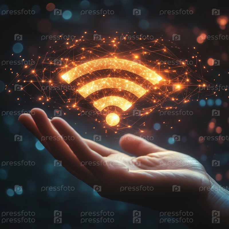 Рука, представляющая светящийся символ беспроводной связи в цифровой среде