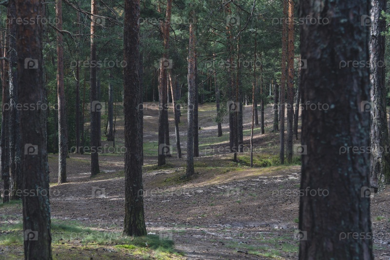 Солнечный лес с сосновыми деревьями и извилистой грунтовой тропой