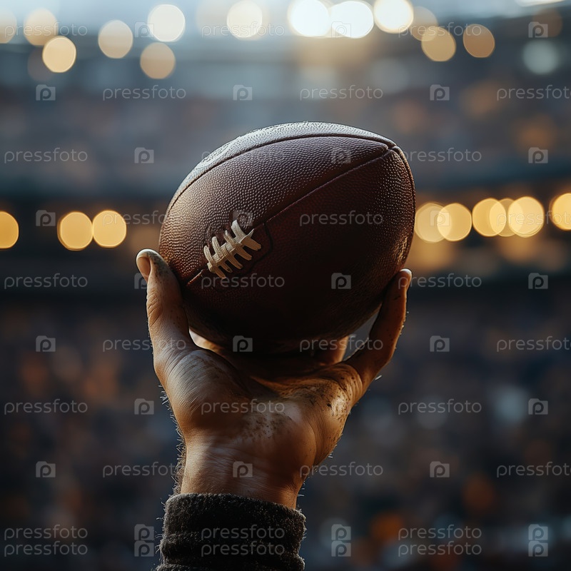 Рука, держащая футбольный мяч на освещенном стадионе ночью