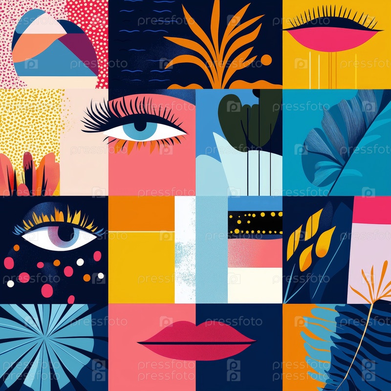 Абстрактный коллаж с красочными глазами, губами и ботаническими