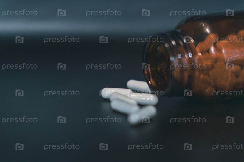 Бутылка с янтарными таблетками разливает белые капсулы на темной поверхности