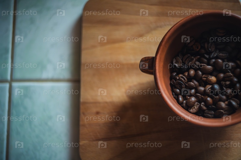 Кофейные бобы в глиняной чашке