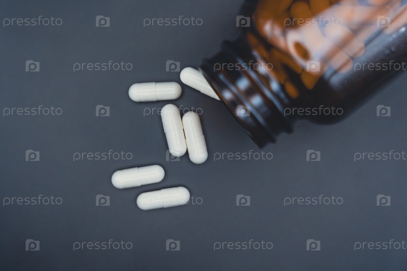 Коричневая стеклянная бутылка с белыми капсулами на темной поверхности