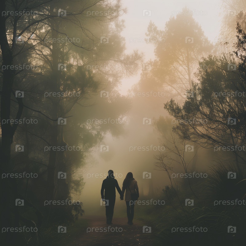 Пара гуляет по туманному лесу на восходе солнца