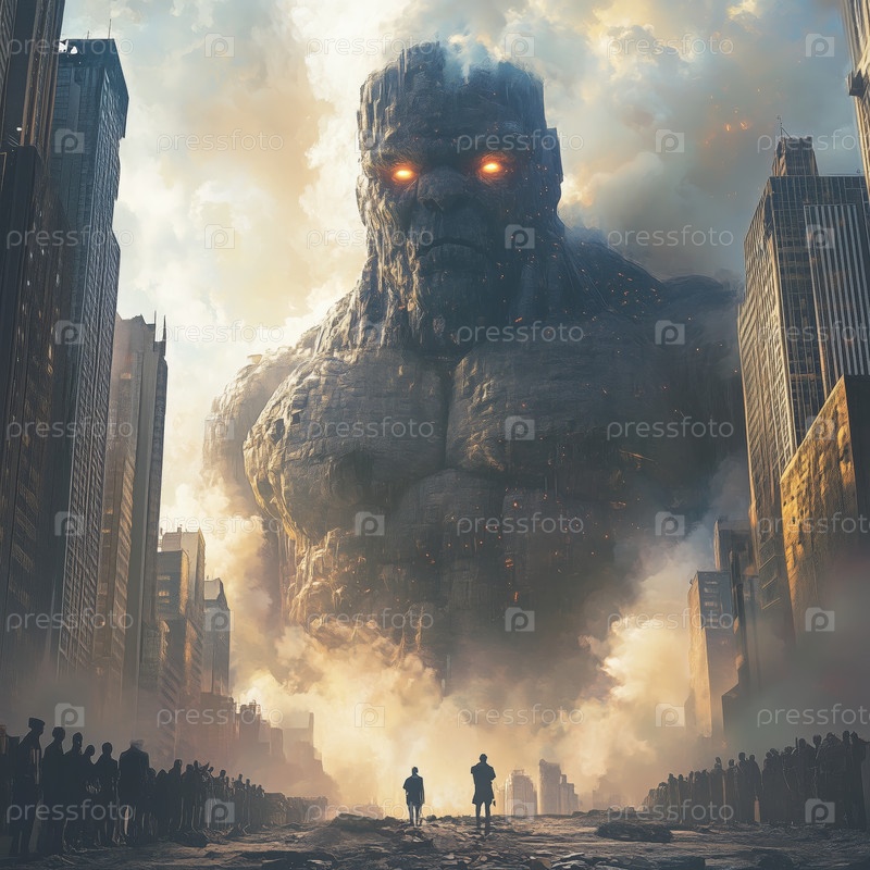 Гигантское каменное существо, возвышающееся над городом со зрителями