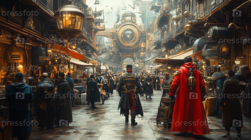 Живая стемпанк-маркетная улица с сложными дизайнами и толпой
