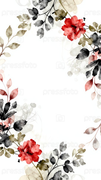 Красные и бежевые цветы изящно рассеиваются рядом с темными листьями, создавая очаровательную границу на чистом белом фоне, вызывая чувство мимолетной красоты Generative AI