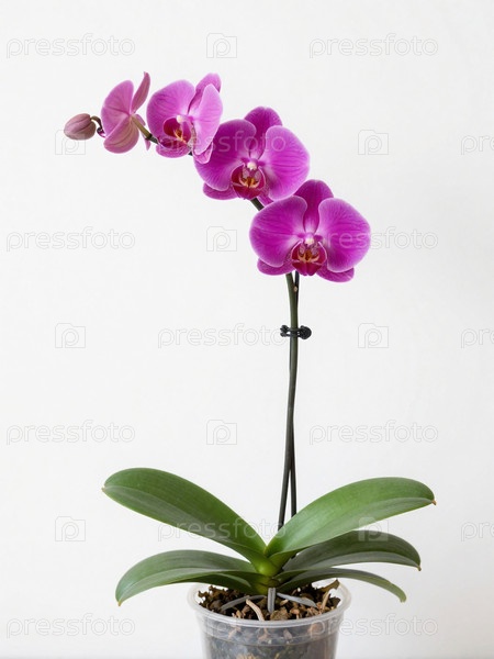 Потрясающий дисплей ярких розовых орхидей гордо стоит в декоративной горшке на чистом белом фоне.Нежные листья подчеркивают красоту природы Generative AI