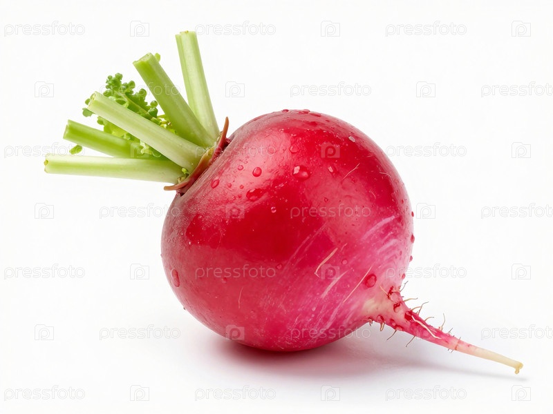 Живая красная редиска с пышной зеленой вершиной на чистом белом фоне.Ее поверхность блестит капельками, намекая на свежесть из сада Generative AI