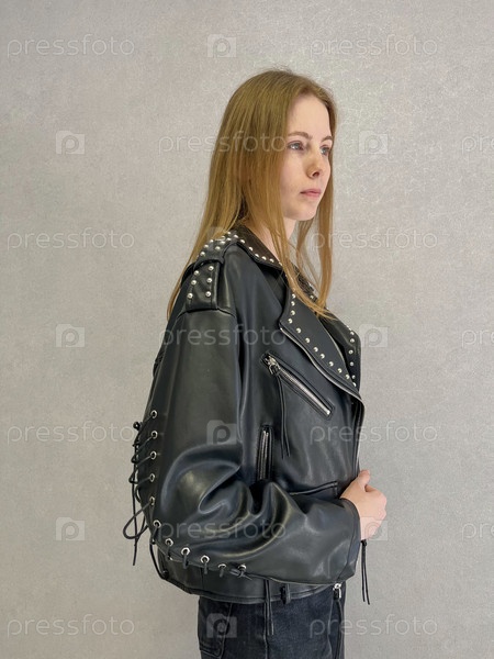22-летняя девушка в короткой черной кожаной куртке