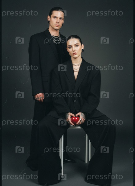Мужчина стоит позади женщины, сидящей на стуле и держащей красное яблоко в темной студии