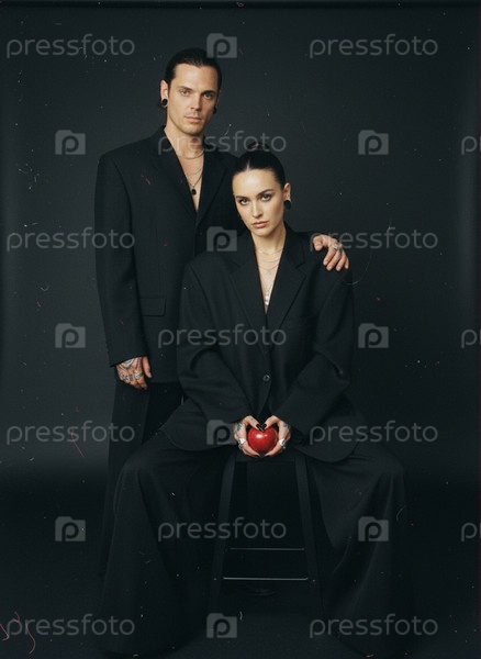 Мужчина стоит позади женщины, сидящей на стуле и держащей красное яблоко в темной студии
