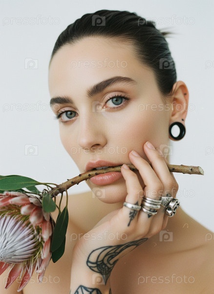 Женщина с цветком протеи в руках позирует на нейтральном фоне в студии клоузап портрет