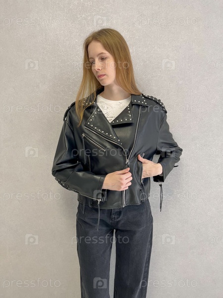 22-летняя девушка в короткой черной кожаной куртке