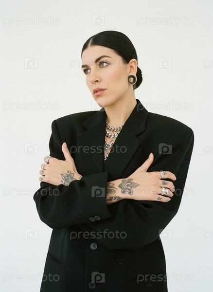 Модель с гладкой прической в черном костюме с татуировками стоит на фоне белой стены в студии