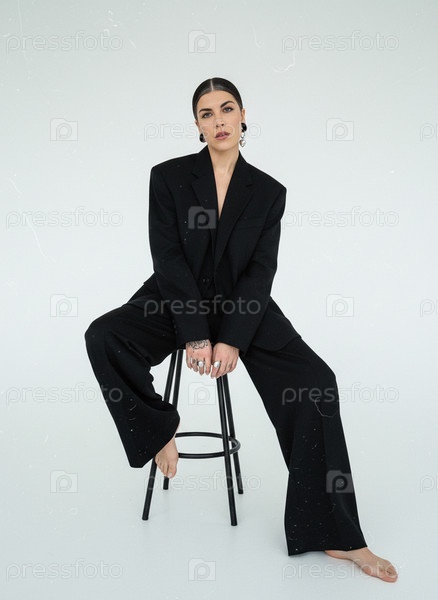 Женщина в черном костюме сидит на стуле и смотрит вперед в студии