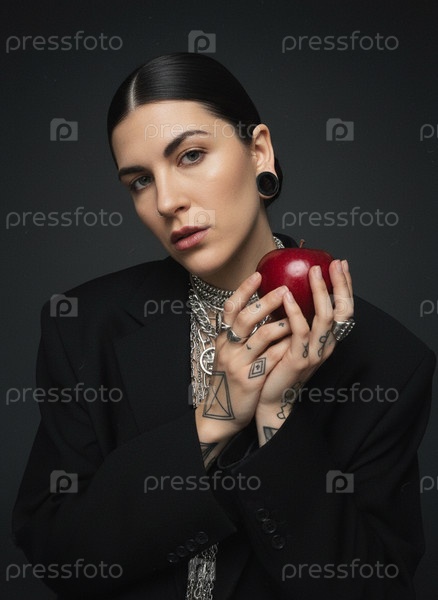 Модель в черном костюме с татуировками и яблоками в руках стоит на фоне темной стены в студии