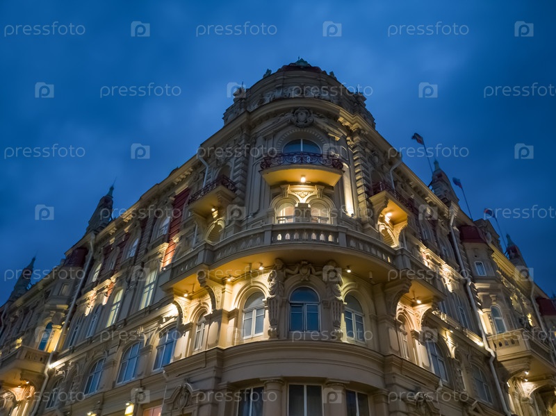 Угловой фасад исторического здания в синих сумерках с теплым освещением
