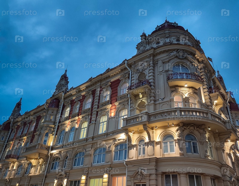 Угловой фасад исторического здания в синих сумерках с теплым освещением