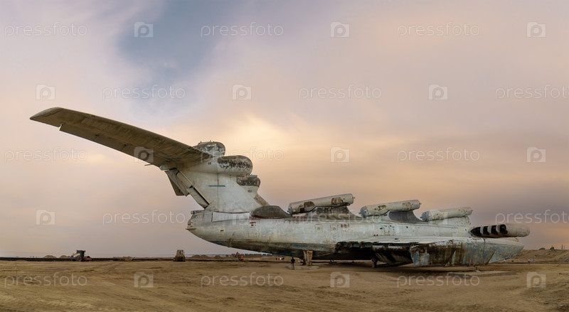 Панорамный вид на закат солнца "Луны", уникального советского военного корабля-ракетника ekranoplan, брошенного на берегу Каспийского моря.Самая современная достопримечательность Дербента, прозванная Каспийским чудовищем